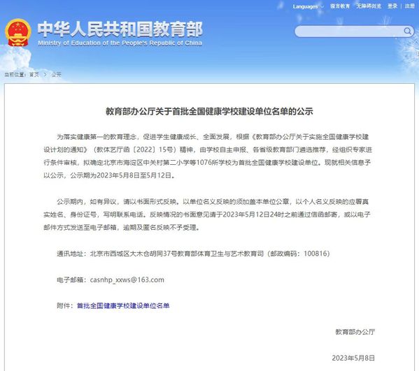 本网讯 2023年5月8日,教育部官网发布了《教育部办公厅关于首批全国健康学校建设单位名单的公示》,我校申报的建设全国健康学校立项获批,这是我校健康学校建设的历史性突破,标志着我校学校健康建设迈上了新台阶。