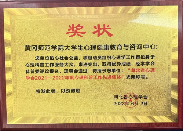 本网讯 我校大学生心理健康教育与咨询中心荣获“湖北省心理学会2021-2022年度心理科普工作先进集体”光荣称号。这一殊荣是对该中心在心理科普工作方面的突出贡献和优异成绩的高度认可。