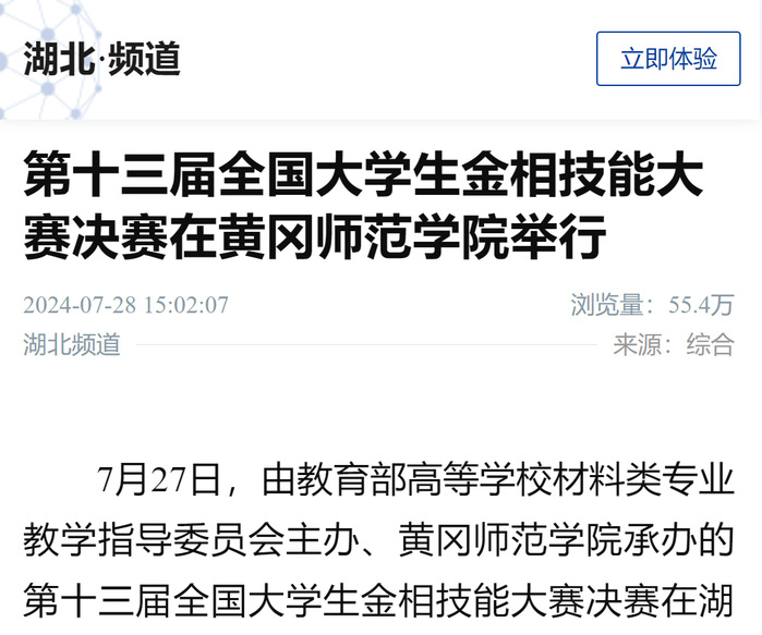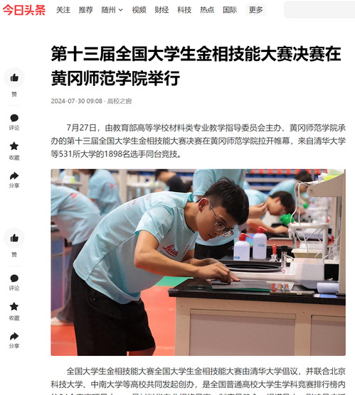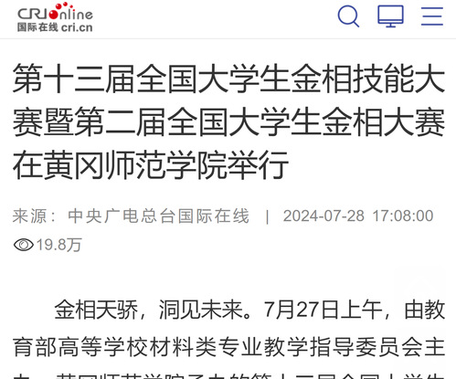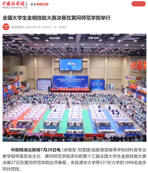 7月25日至30日,第十三届全国大学生金相技能大赛决赛在我校举行,来自清华大学等531所大学的1898名选手同台竞技。该大赛是材料类专业规格最高、制度最健全、规模最大、影响最广泛的全国性大学生学科赛事,受到媒体广泛关注,新华社、光明日报、中央广电总台国际在线、中国教育报、中国青年报、中新网、中华网、高校之窗、中国教育在线、新浪新闻、网易新闻、湖北日报、极目新闻、长江云、荆楚网、黄冈日报等众多主流媒体对大赛盛况进行了专门报道。